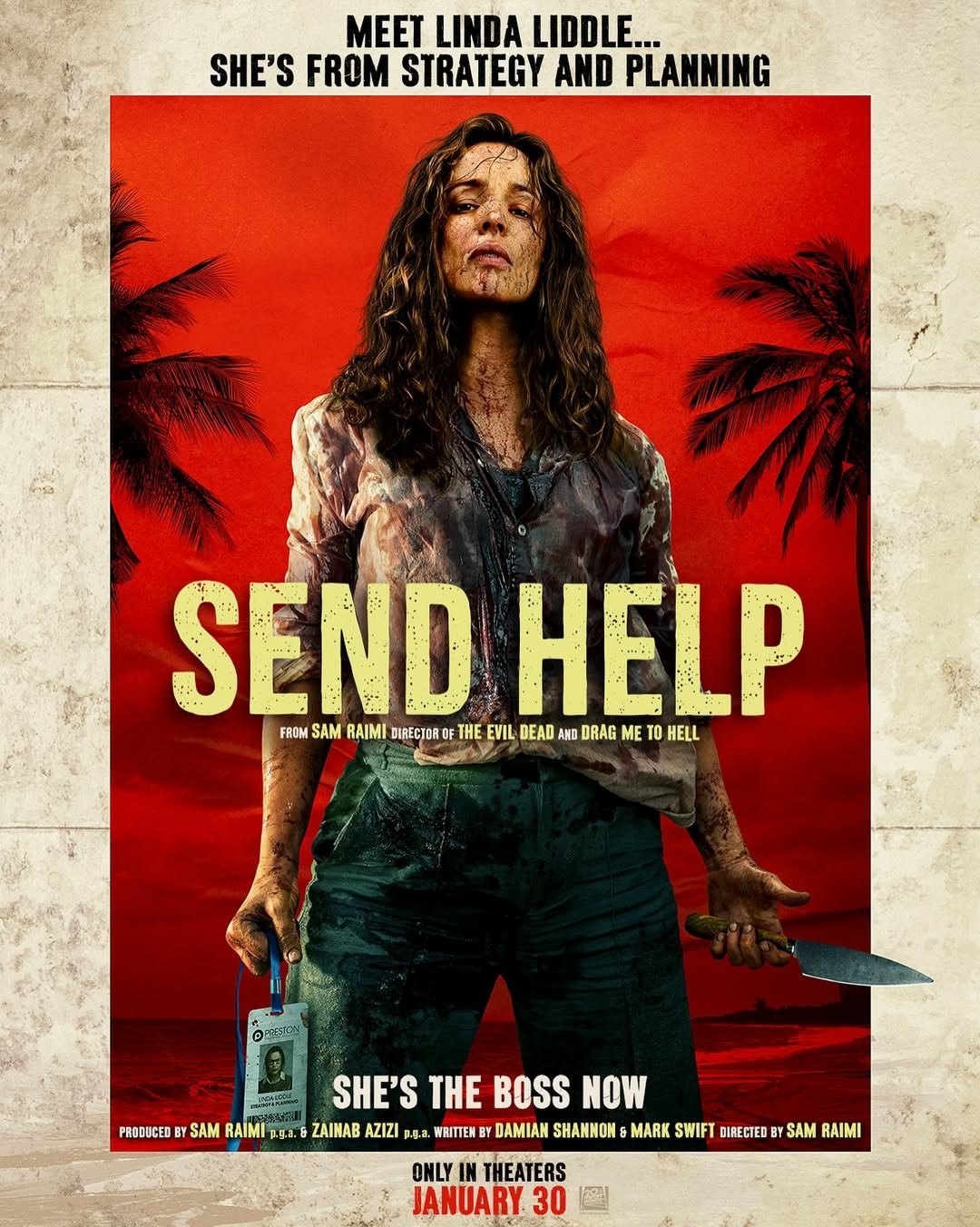 Send Help va fi lansat in cinematografele pe 30 ianuarie 2026 si are la baza un scenariu original semnat de Damian Shannon si Mark Swift (Baywatch). Sam Raimi este producator alaturi de Zainab Azizi, prin Raimi Productions, iar JJ Hook este producator executiv.